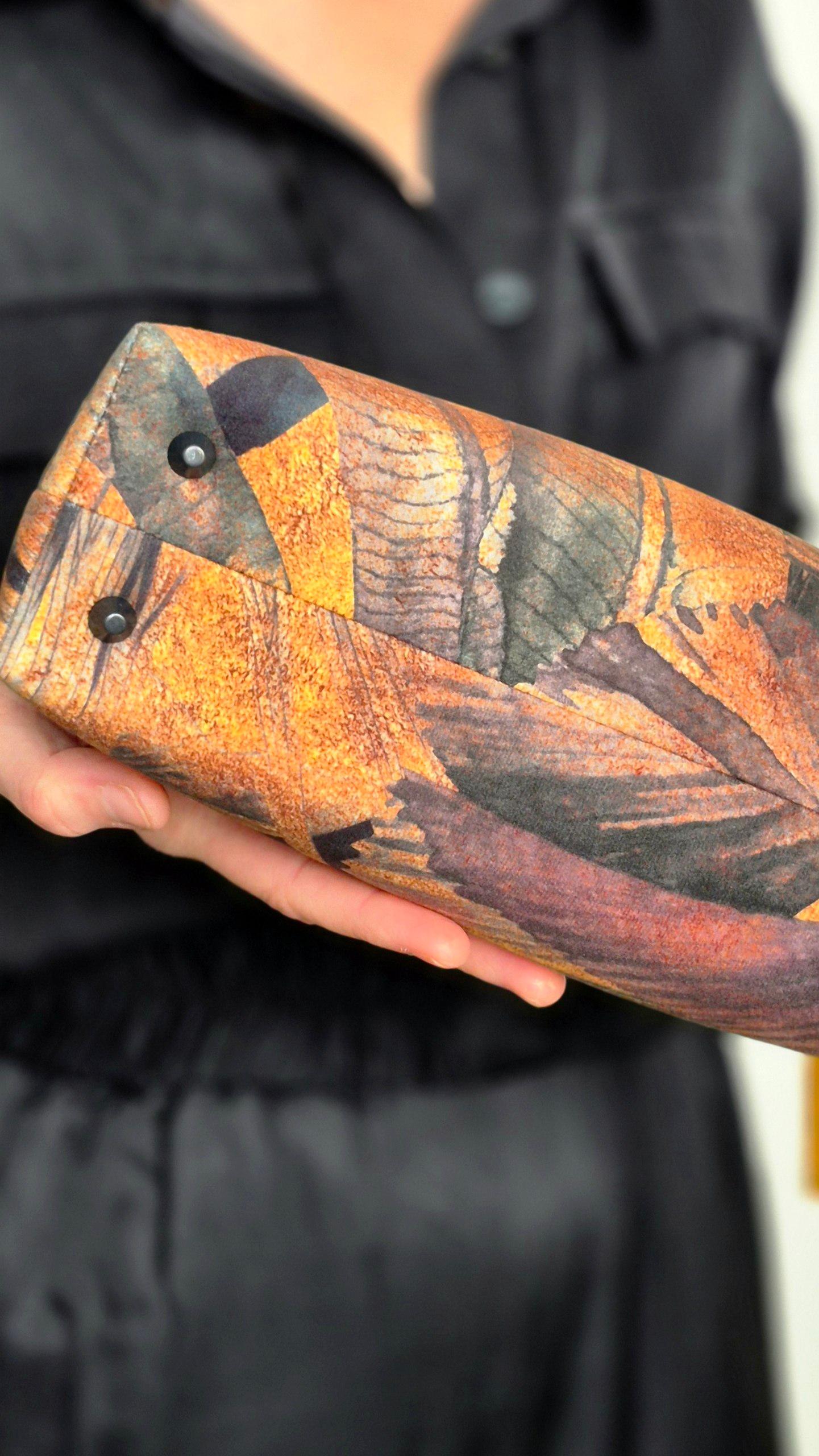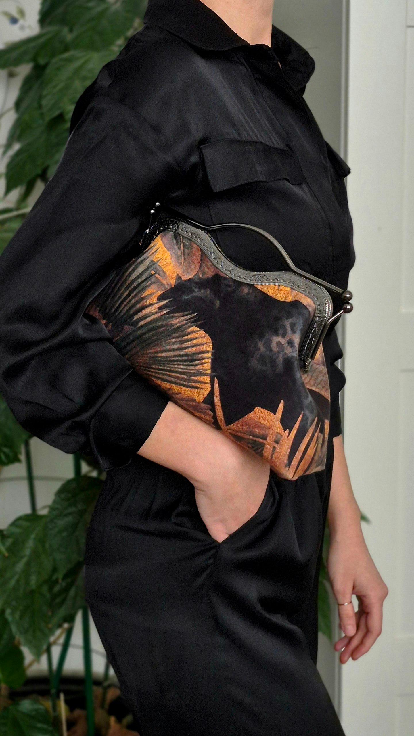 Главный акцент сделан на изображении черной пантеры среди тропических листьев. Сочетание глубокого черного и теплых охристо-рыжих оттенков создает атмосферу «городских джунглей». Фактура ткани напоминает бархатистую поверхность, что добавляет принту объема.